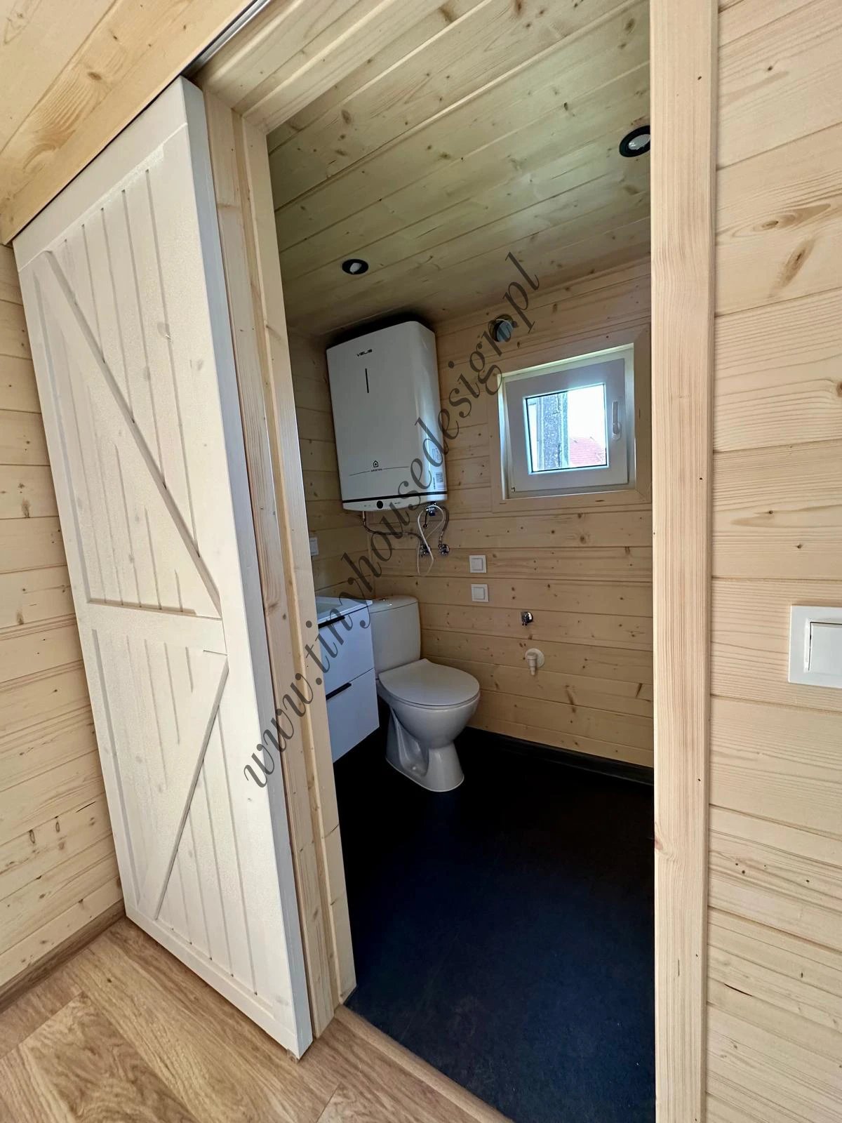 - Wnętrze wykończone naturalnym drewnem, drzwi w kolorze białym;