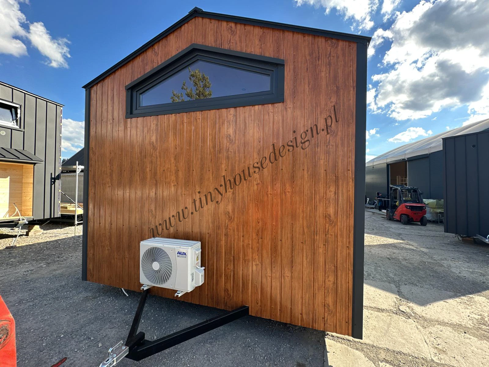 Elewacja domku wykonana jest w firmowym stylu Tiny House Design i skutecznie chroni budynek przed czynnikami zewnętrznymi. Symetrycznie rozstawione okna wyglądają estetycznie i wpuszczają do wnętrza dużo światła.