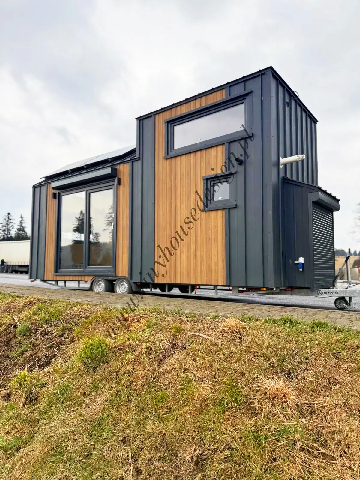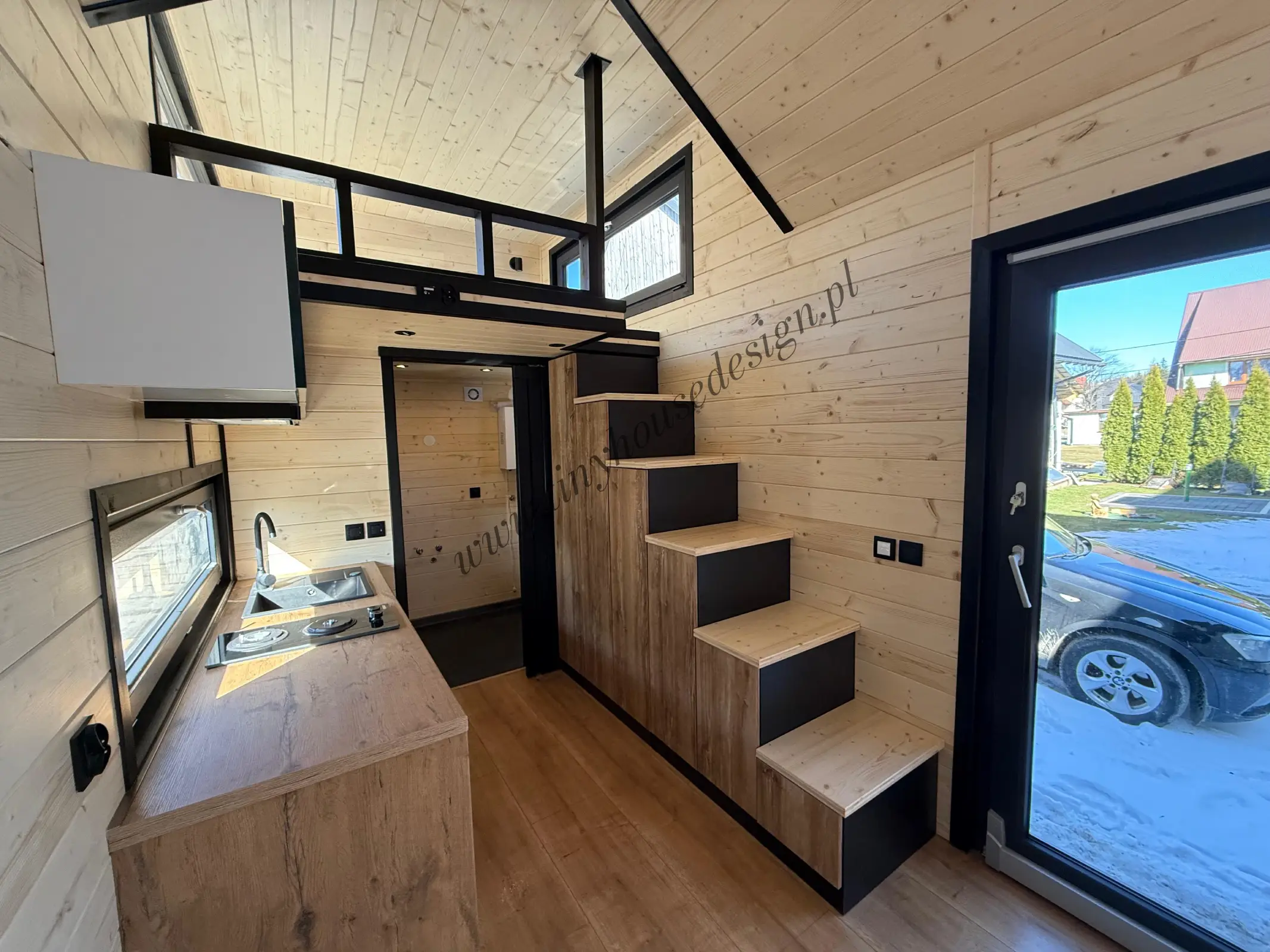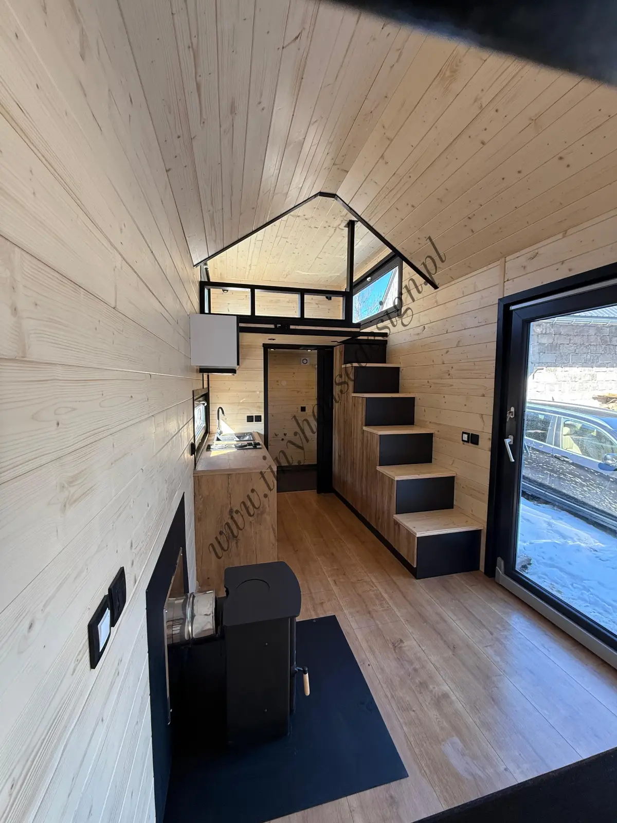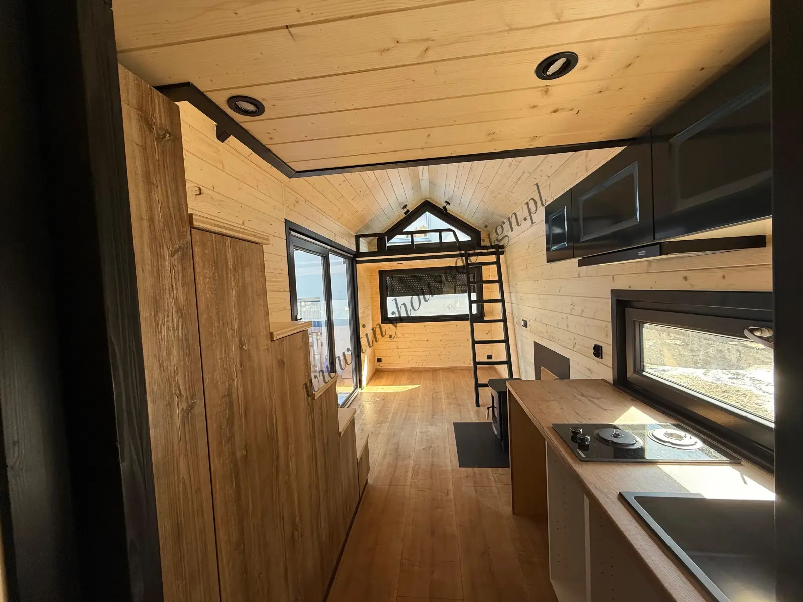 Domek mobilny Julian charakteryzuje się eleganckim wnętrzem dzięki połączeniu naturalnego drewna i czarnych wstawek. Na parterze standardowo znajduje się salon z aneksem kuchennym z bezpośrednim wejściem z ogrodu. Sypialnie znajdują się na dwóch antresolach. Model ogrzewany jest nadającym klimat piecykiem na drewno. Na dachu zamontowane są praktyczne panele fotowoltaiczne dzięki czemu domek jest samowystarczalny, jeśli chodzi o energię.