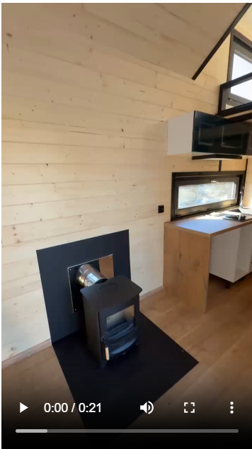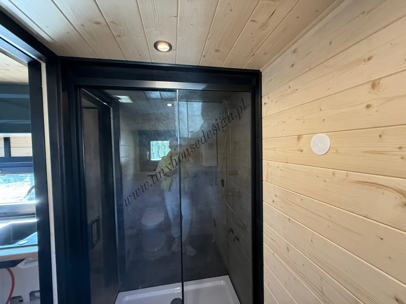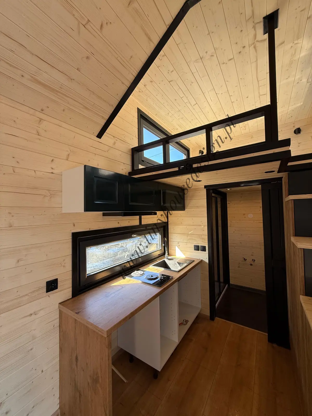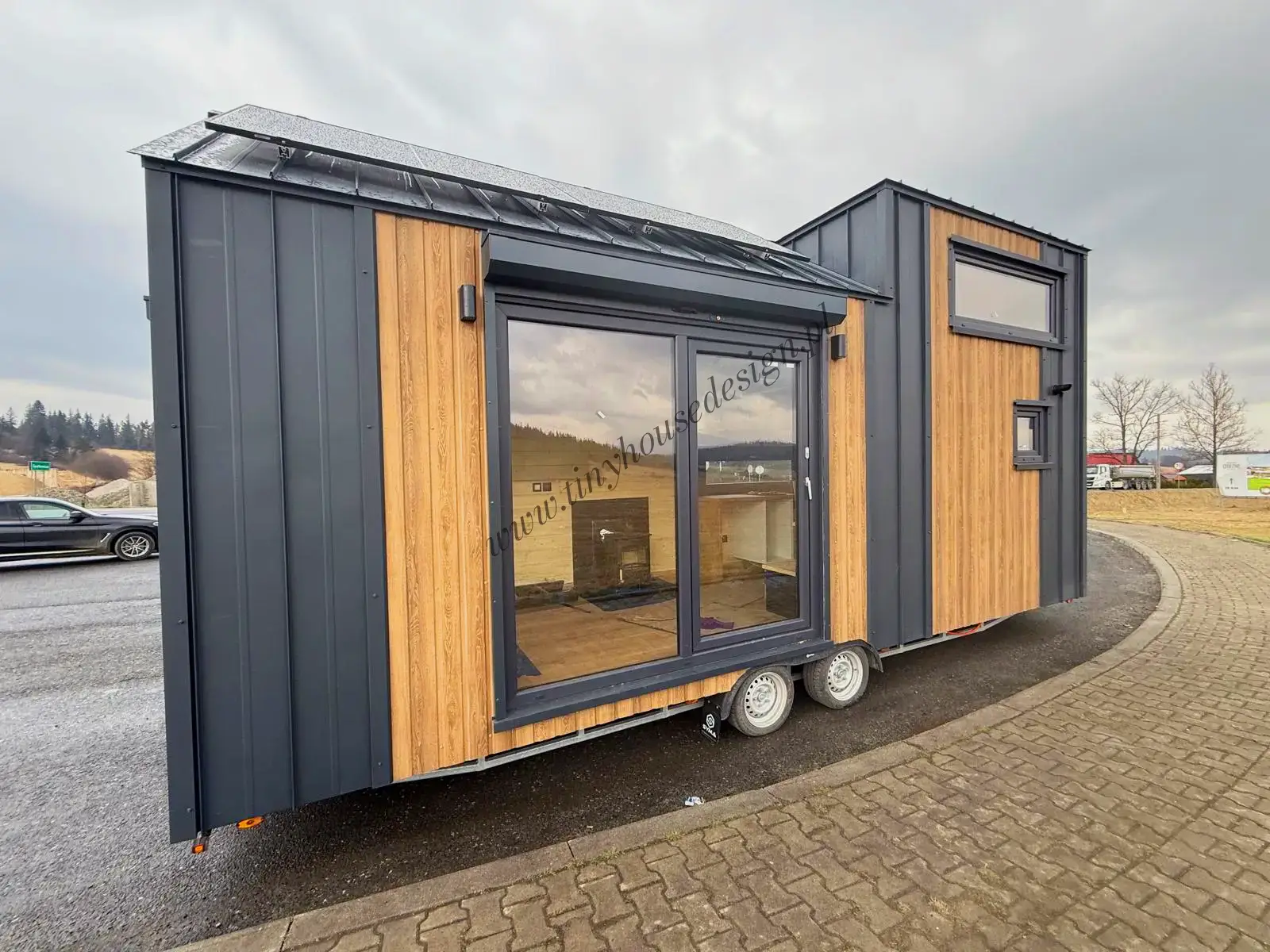 Domek mobilny Julian charakteryzuje się eleganckim wnętrzem dzięki połączeniu naturalnego drewna i czarnych wstawek. Na parterze standardowo znajduje się salon z aneksem kuchennym z bezpośrednim wejściem z ogrodu. Sypialnie znajdują się na dwóch antresolach. Model ogrzewany jest nadającym klimat piecykiem na drewno. Na dachu zamontowane są praktyczne panele fotowoltaiczne dzięki czemu domek jest samowystarczalny, jeśli chodzi o energię.