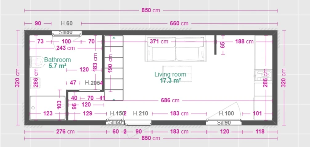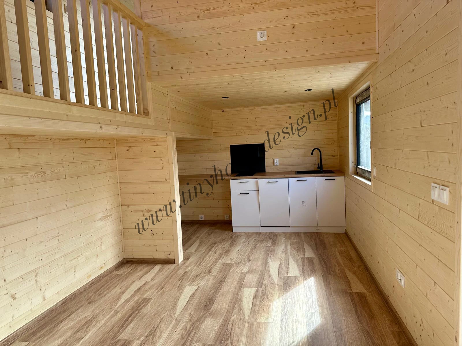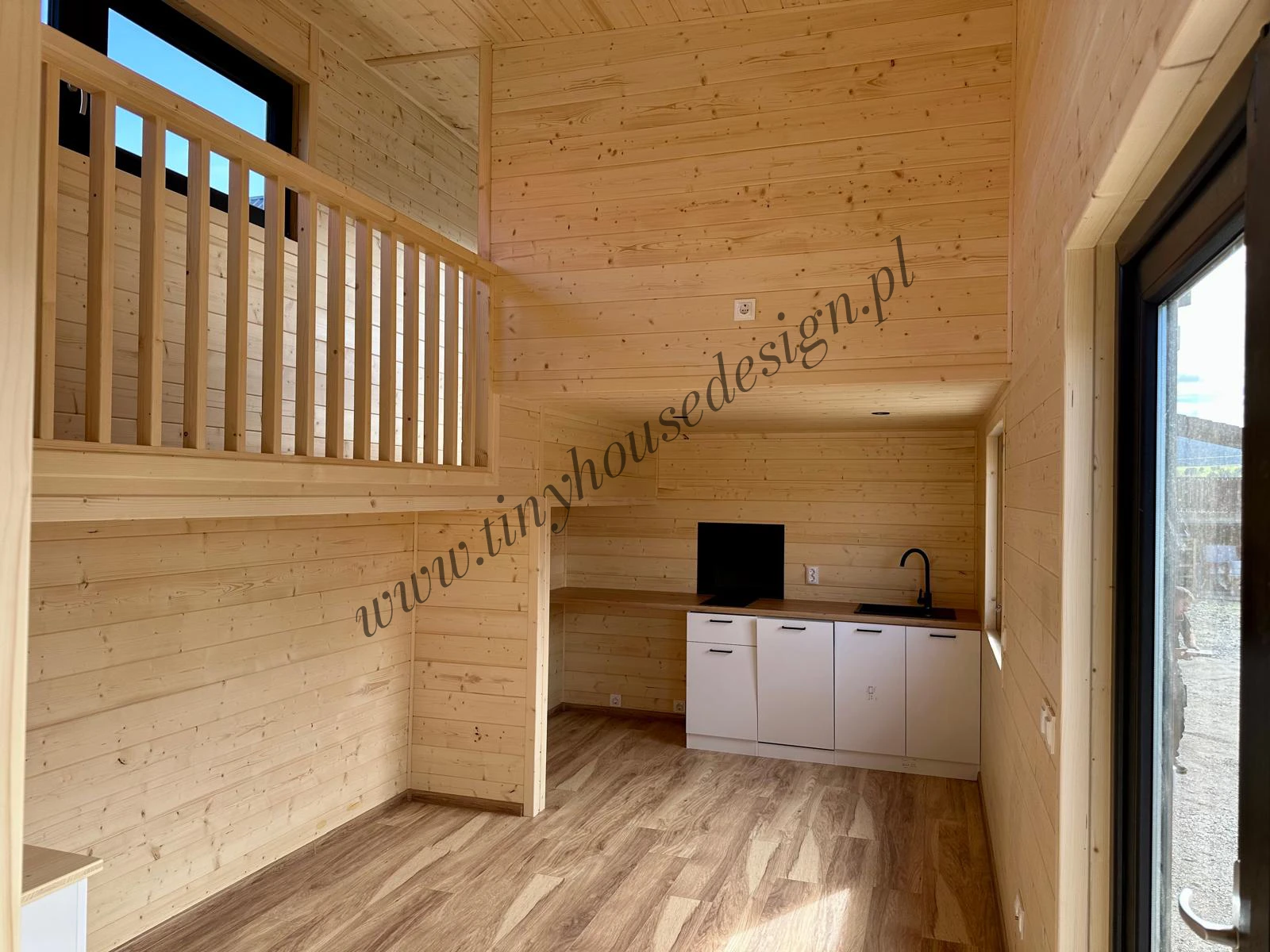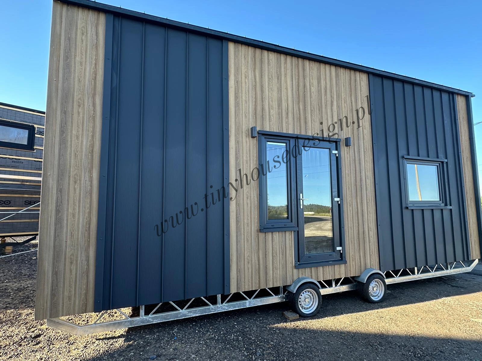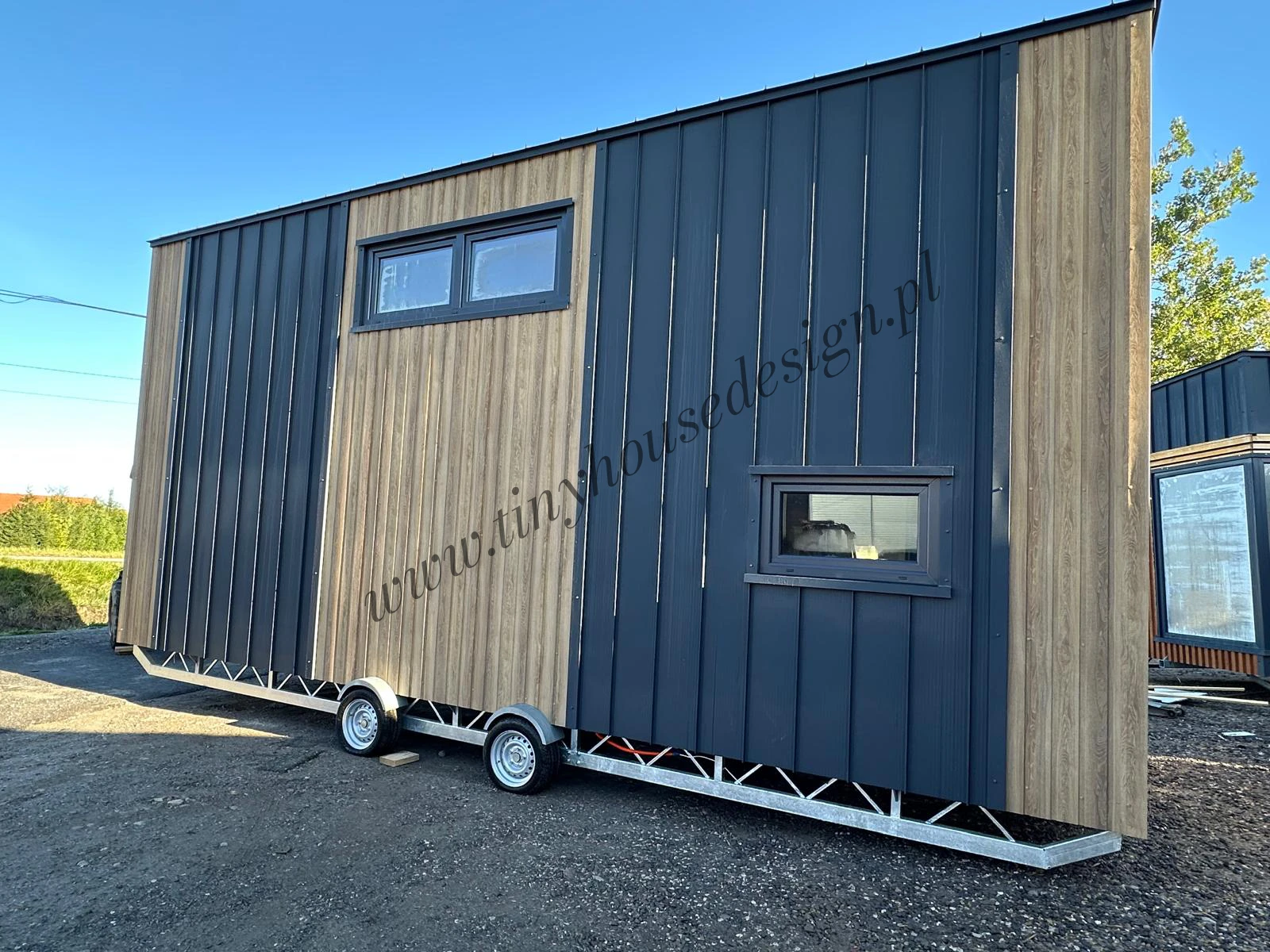 Mobilny domek Oleńka to całoroczna kompaktowa wersja tiny house jak zawsze przytulna i estetyczna dzięki drewnianym wykończeniom wnętrz i zastosowaniu trwałej blachy na rąbek jako elewacji. Zaprojektowany w oparciu o model Ola, lecz zoptymalizowany na potrzeby naszych klientów na mniejszą działkę (8,5 m długości i 3,2 m szerokości). Odwróciliśmy pomieszczenia na parterze. Tiny house Oleńka ma łazienkę po lewej stronie i aneks kucheny po prawej. W centrum budynku jak zwykle jest przytulny salon z widokiem na ogród. Możesz go postawić niemal wszędzie, bez formalności związanych z tradycyjną budową.