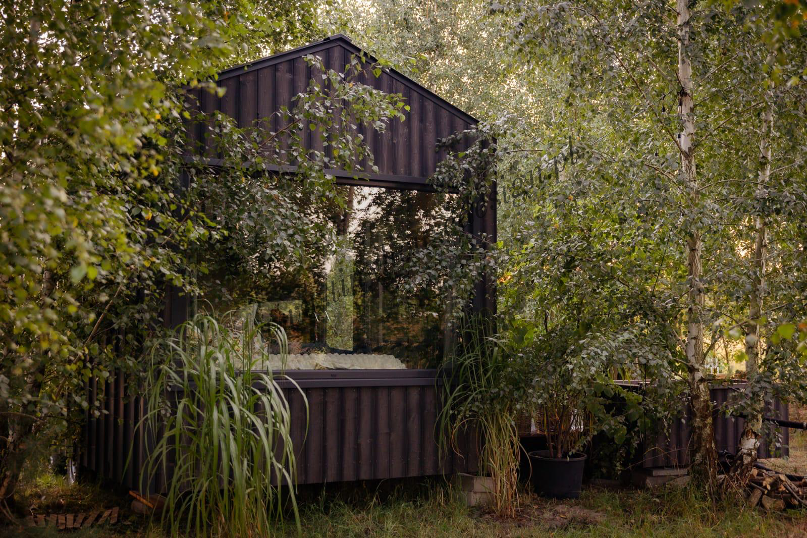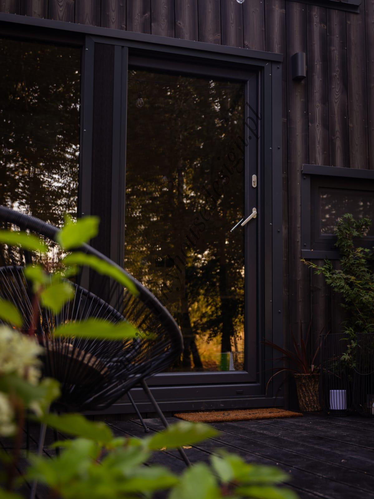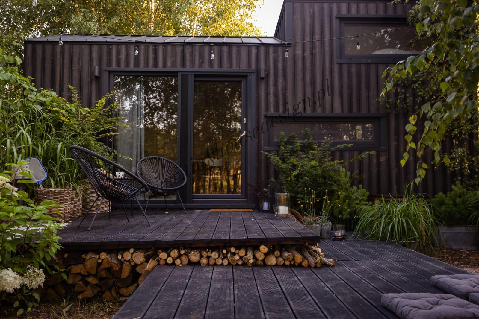 Domek mobilny Tomek Shadow to urozmaicona bryła, której lekkości dodają okna a elegancji fasada w ciemnym kolorze, która pięknie komponuje się z zielenią wokół domku.