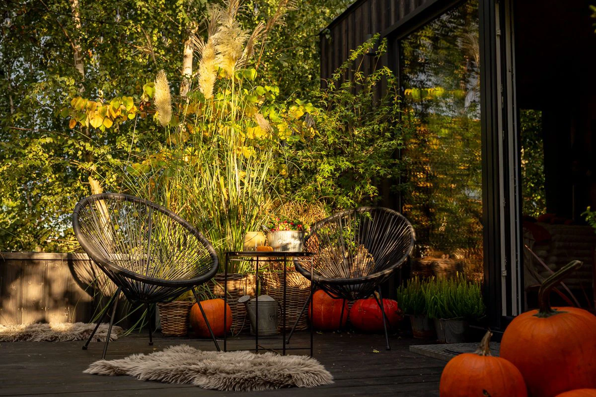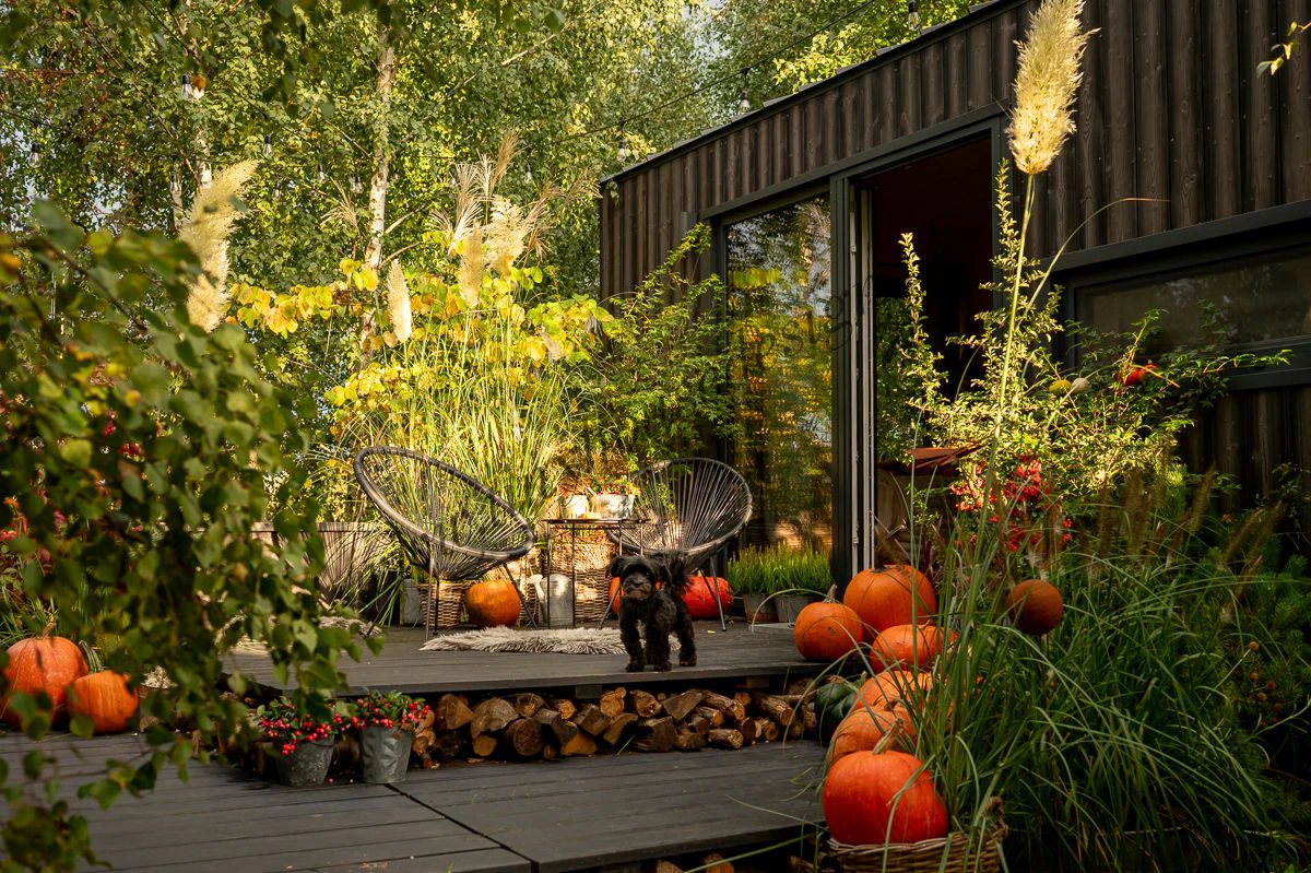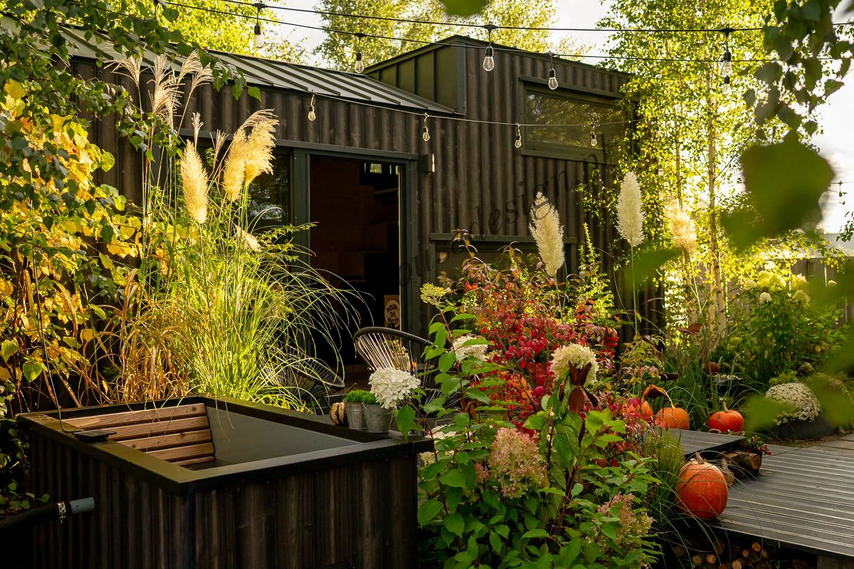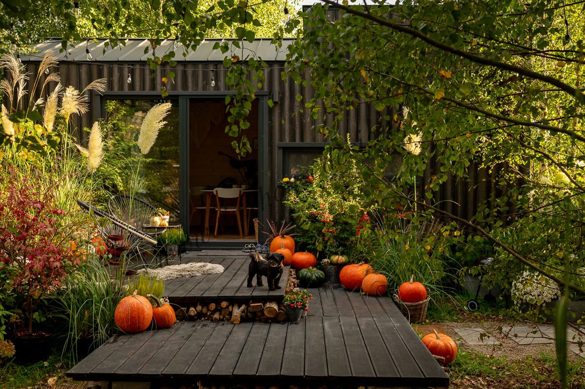 Domek mobilny Tomek Shadow to urozmaicona bryła, której lekkości dodają okna a elegancji fasada w ciemnym kolorze, która pięknie komponuje się z zielenią wokół domku.