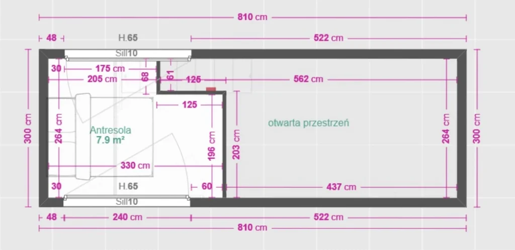 - Bryłę budynku z podniesioną częścią mieszczącą antresolę.