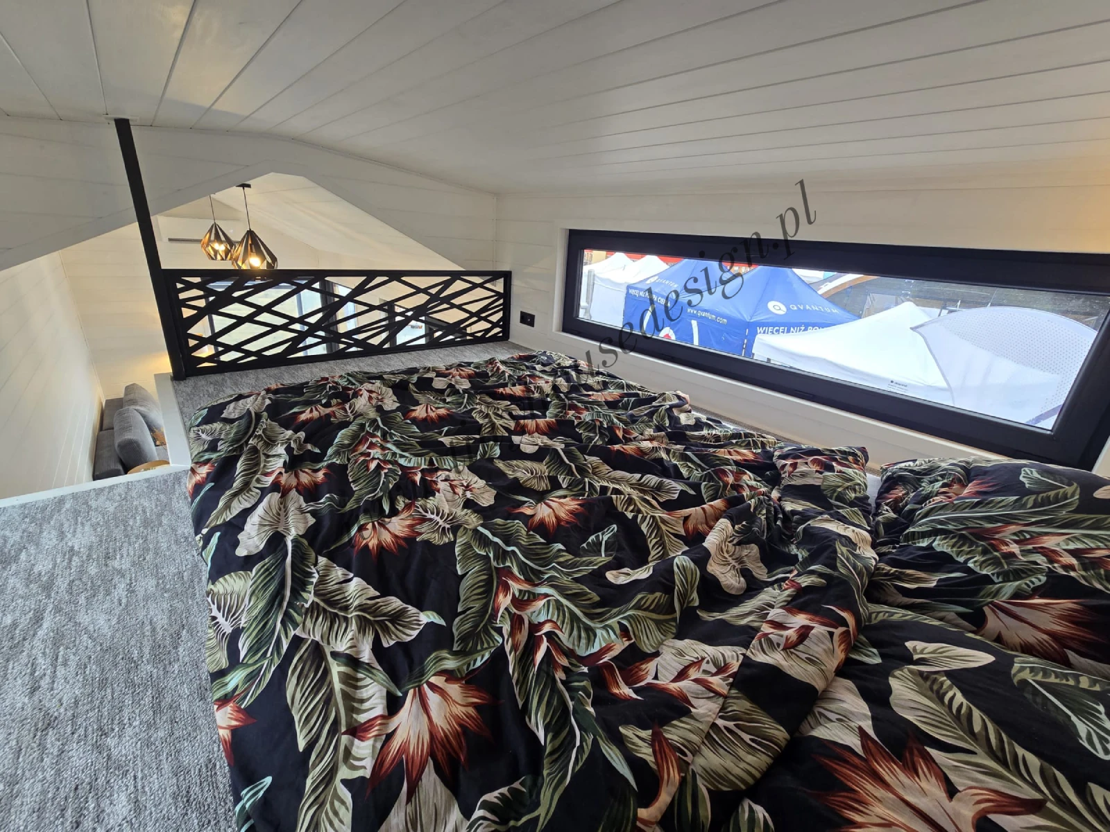Metamorfozę przeszła też sypialnia na antresoli. To wciąż kameralne miejsce z oknami, które pozwalają na podziwianie widoków tuż po otwarciu oczu. Sypialnia jest teraz jednak znacznie większa. Oprócz wygodnego podwójnego łóżka znajdzie się tu dodatkowa przestrzeń na przechowywanie rzeczy osobistych. Ta odrębna przestrzeń daje poczucie prywatności w otwartej zabudowie tiny house.