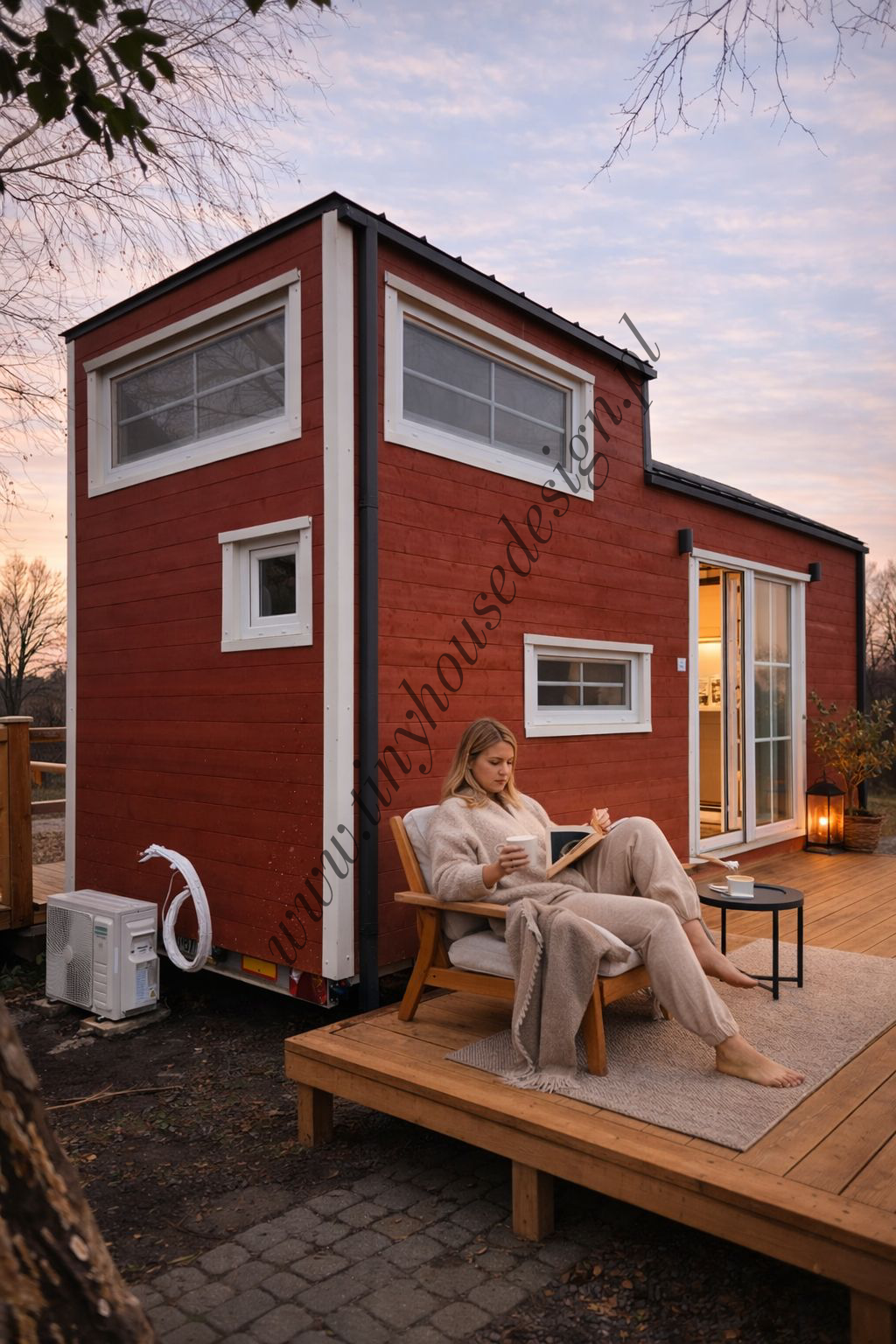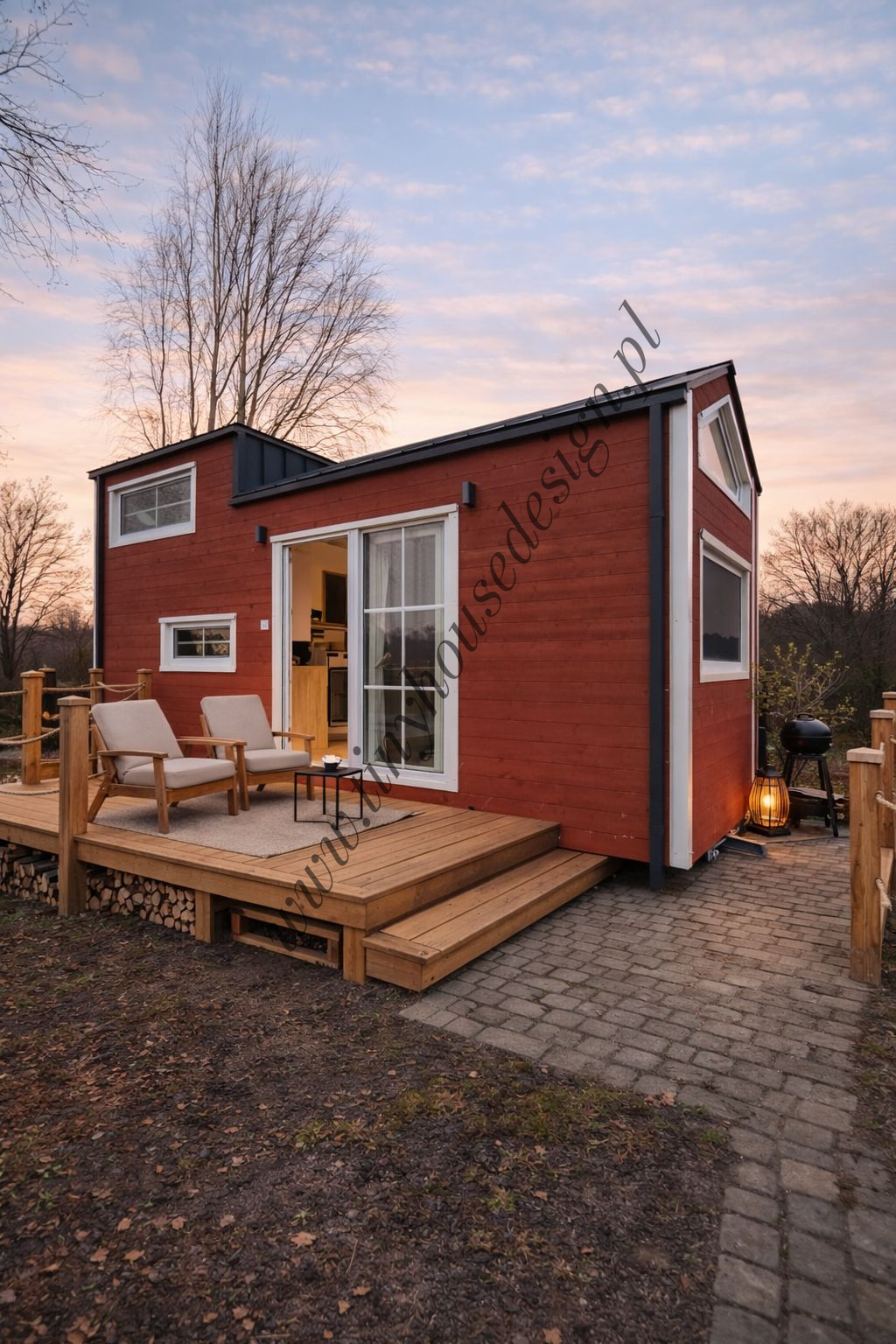 Fasada domku zachwyca ciepłym, naturalnym drewnem, nawiązującym do urokliwych domków Północy. Uroku minidomowi dodają okna dekorowane szprosami w jasnej ramie, które kontrastują z kolorem elewacji. Konstrukcja bez zmian: mobilny domek szkieletowy na stalowej ramie, ocieplony, izolowany, w pełni funkcjonalny. Na urlop wśród leśnej głuszy, na wynajem, jako domek letniskowy, do zamieszkania przez cały rok.
