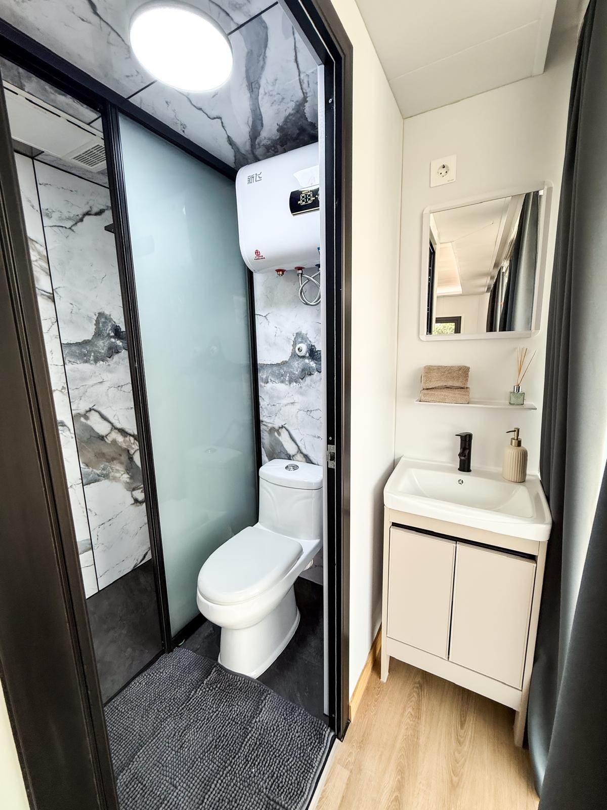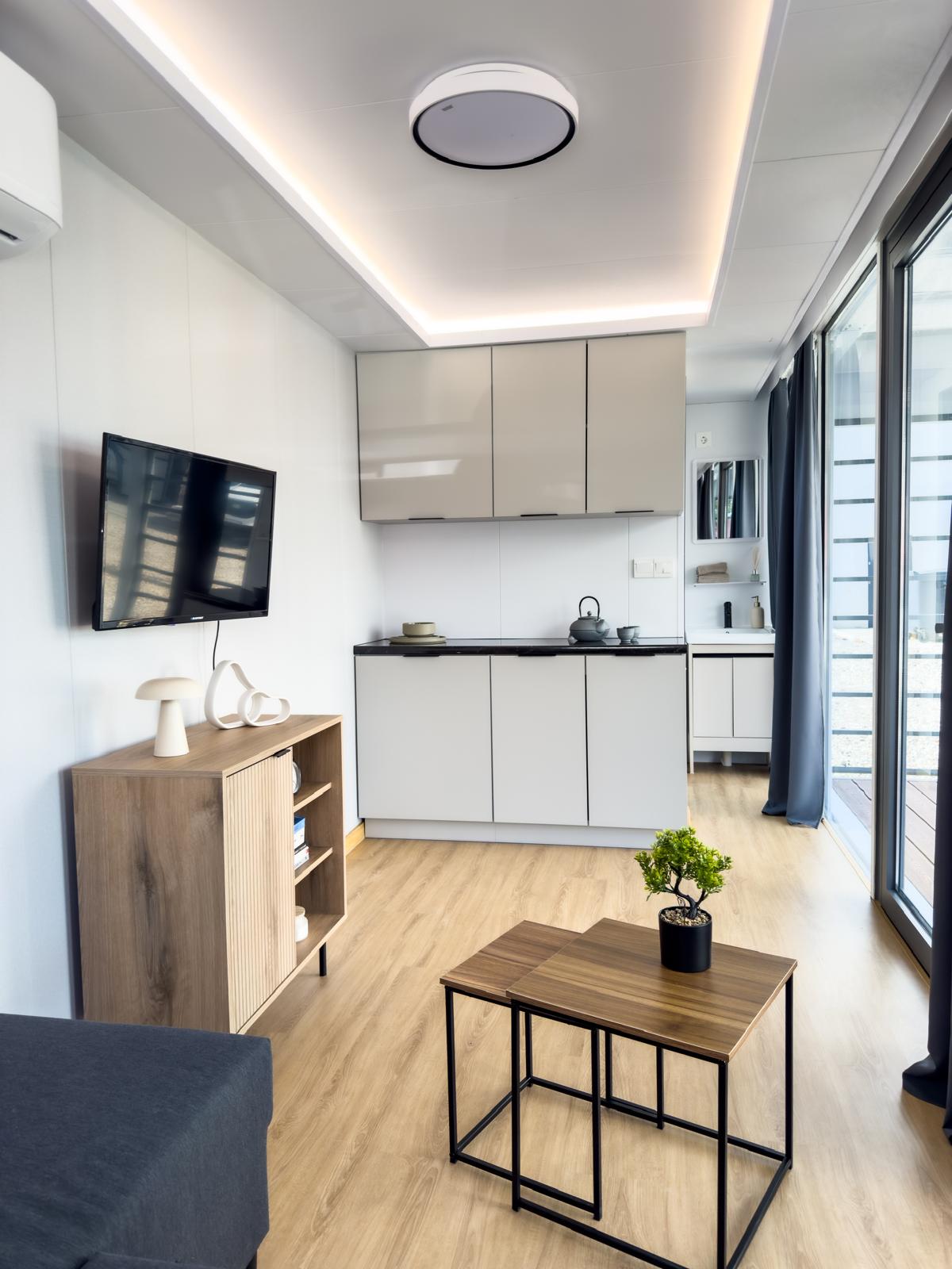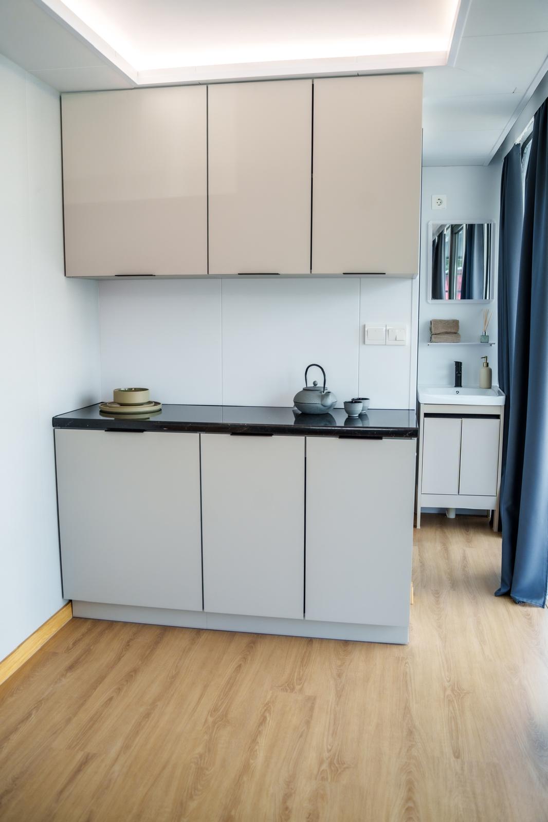 Budynek ma praktyczny układ pomieszczeń, które możesz dopasować pod swoją działalność: pomieszczenie główne, do którego wchodzi się bezpośrednio z ulicy i dodatkowe pomieszczenie, które może stać się sypialnią lub przestrzenią usługową. Qube House 6 ma toaletę z prysznicem i pełnym podłączeniem instalacji hydraulicznej i elektrycznej, jest ogrzewany i klimatyzowany. Bryła budynku połączona jest z tarasem - przytulnym miejscem oczekiwania klientów. Ten gotowy budynek możesz wykorzystać na wiele sposobów w swoim biznesie.
