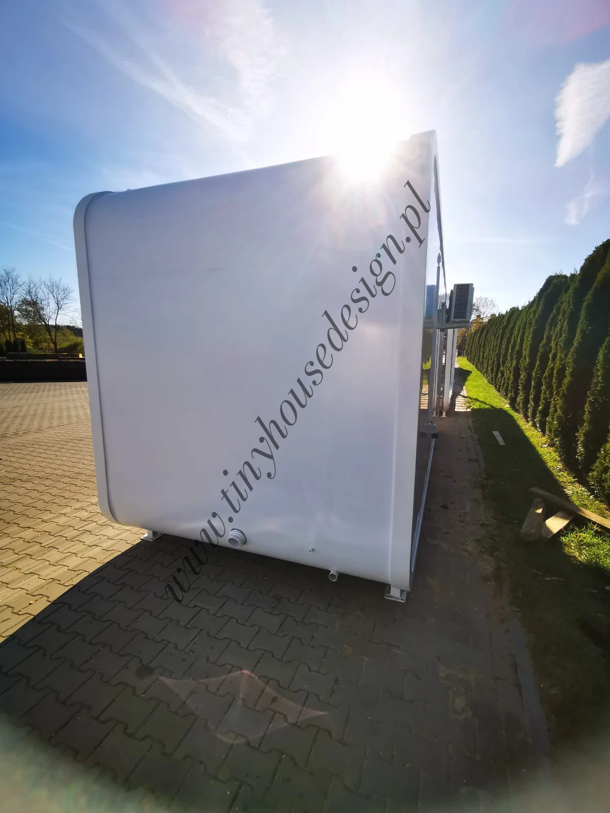 Budynek ma instalacje: elektryczną, hydrauliczną, ogrzewanie i klimatyzację. Przebywasz we wnętrzu w komfortowych warunkach cały rok. Przeszklony front zapewnia dużo naturalnego światła, przyciąga wzrok i zaprasza klientów do wnętrza. Wyposażenie poszczególnych pomieszczeń jest opcjonalne.